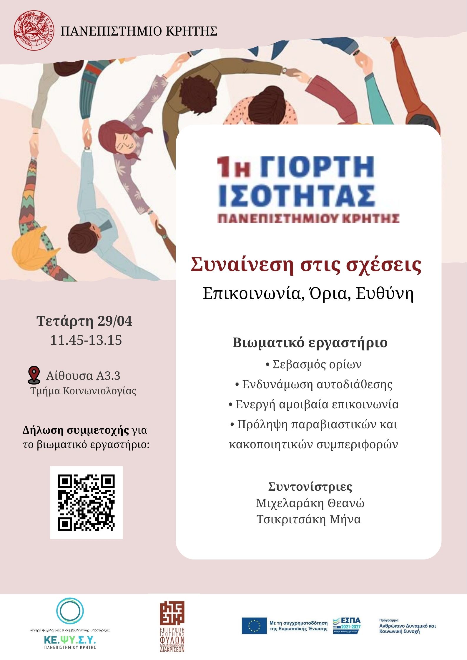 1η Γιορτή Ισότητας Ανακοινώσεις 27 Απριλίου 2026 / 0 Comments Submitted by epatsahaki@uoc.gr on 27 Απριλίου 2026