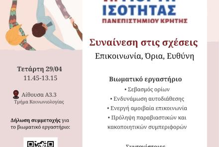 Θα πραγματοποιηθούν 5 εργαστήρια κίνη­σης και συμπερίληψης, απευθυνό­μενα σε προπτυ­χιακούς και μεταπτυχια­κούς φοιτητές/τριες, εκπαιδευτι­κούς και επαγγελματίες που επιθυμούν να εργα­στούν με το σώμα, την κίνηση και τη διαφορε­τικότητα. Τα εργαστήρια θα εστιάζουν: στη βιωματική κατανόηση της συμπερίληψης, στην αποδόμηση φόβων και αναστολών των εκπαιδευτικών, στην πρακτική προσαρμογή κινητικών δραστη­ριο­τήτων, στη συνδημιουργία ασφα­λών και προσβάσιμων μαθησιακών χώρων.